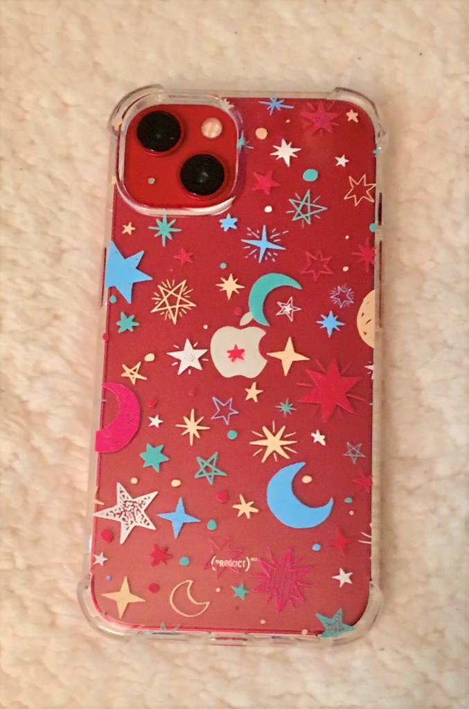 And, of course, I had to get a new case for it. In the end, the possibilities came down to two—sea life in white, including a narwhale, on a clear frame or multi-colored celestial on clear. My purse is a Vera Bradley quilted sea life pattern but I went with the celestial because I’ve drawn stars since I was little and that’s just more me.