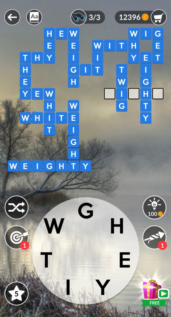 Because it’s a free app, there are lots of bright, noisy ads. I’ve gotten used to them—it’s the price you pay for “free”. Every day, you get to pick a “present” that can be tokens that add to the score, a rocket that can be used to spell out an entire word or a bullseye that can give you the letter in any square you chose. The rockets and bullseyes can also be bought, I think, but I don’t spend money on this.