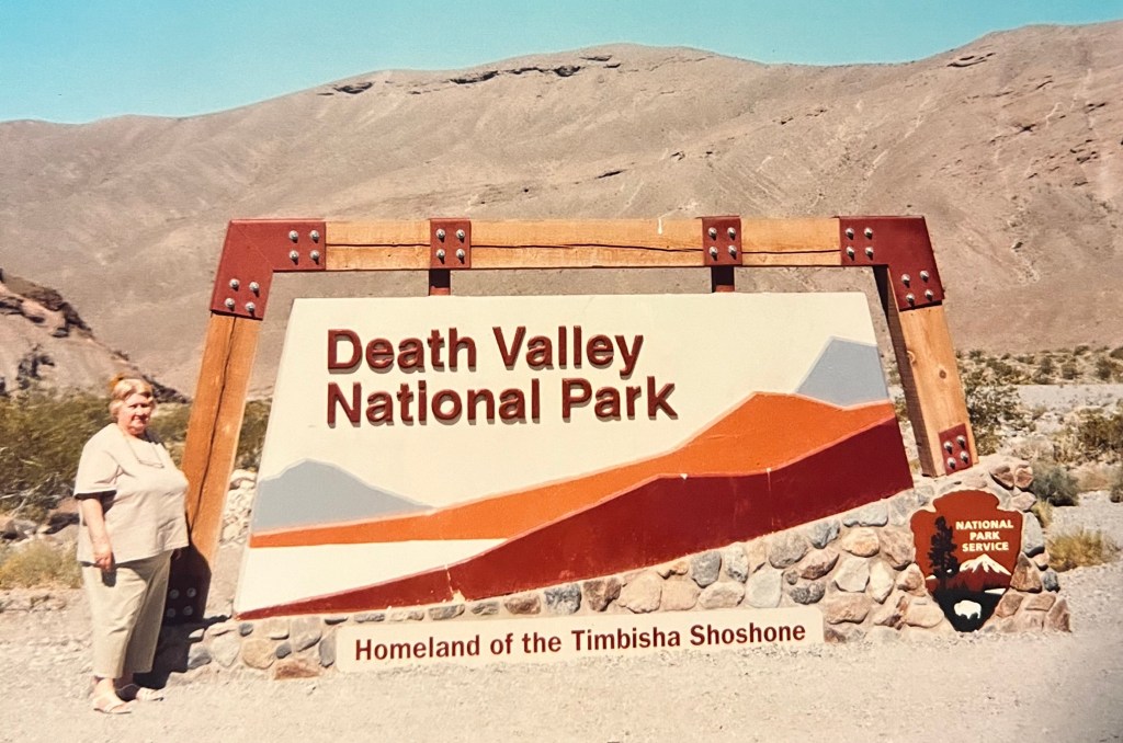 At that time, they closed the park from early May to sometime in the fall, so we had to push the visit up to April but she didn’t mind. She flew into Las Vegas and we drove from Southern CA, picking her up and driving out into the desert. We toured Scotty’s Castle, kind of a mini-Hearst Castle, and stayed at Stovepipe Wells, in the heart of the park. When we arrived at 7PM, it was still over 100 degrees! But seeing the cloudless blue sky turn gradually to an incredible field of sparkling stars was so worth the heat and drive.