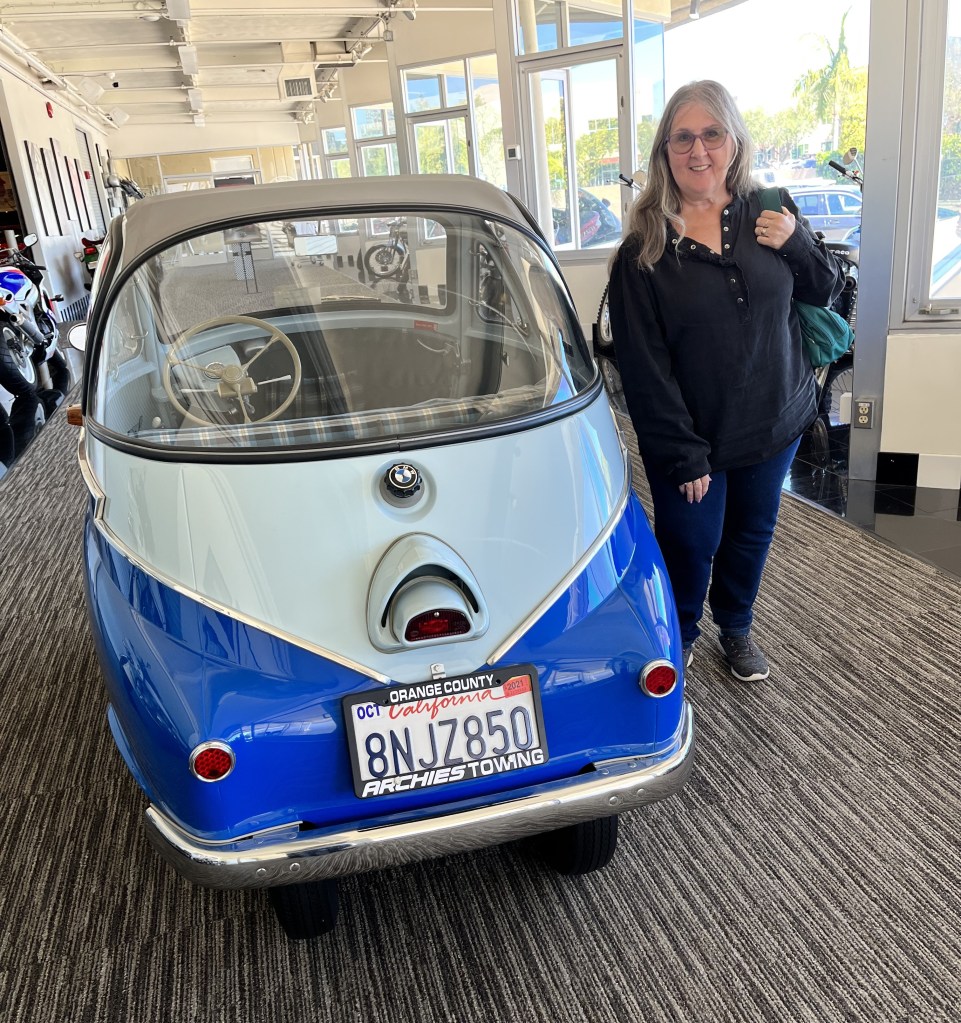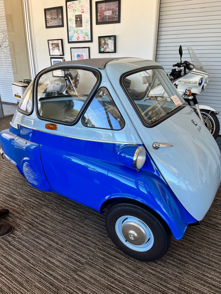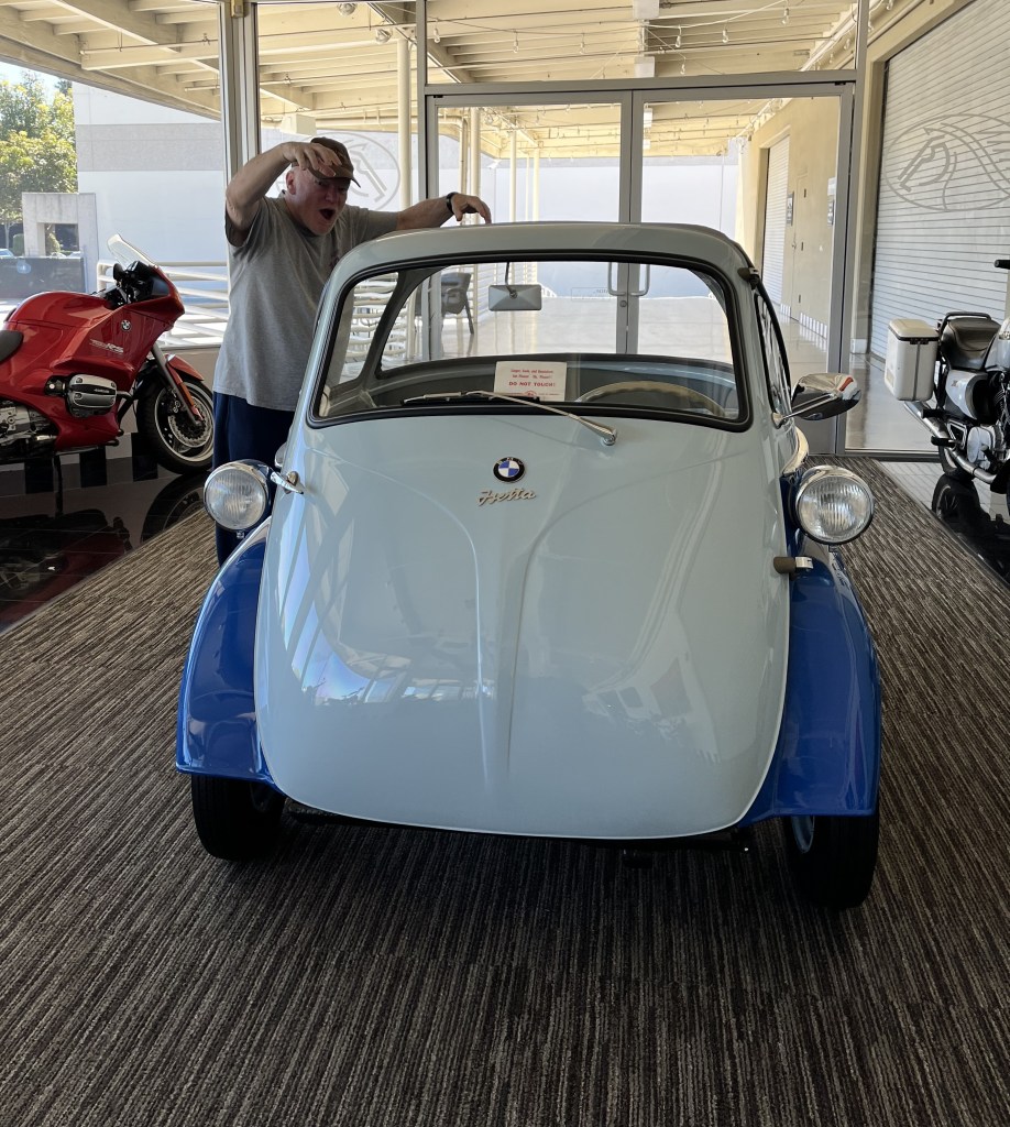 And this tiny little BMW Isetta was probably our favorite car in the group. Made from 1953-62, only about 1000 out of 161,360 remain. You can see the hinge on the right, in front of the light, and the door handle on the left–yup, you open the front of the car to get in! And it’s just our size! 😊